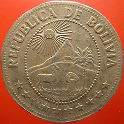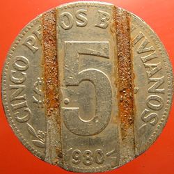 boli 30 | (coin) REPUBLICA DE BOLIVIA ********** / (scenery) | CINCO PESOSBOLIVIANOS / $b.5.- / 1980 (2 x g) | Bolivia | WM/S | 28.8 | Sd | 0 | |
